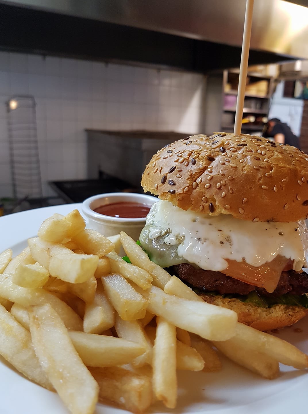 Char-grilled Angus beef patty with bacon, egg, onion, lettuce, tomato, cheese, with home made sauce, on a gourmet bun, served with chips.0